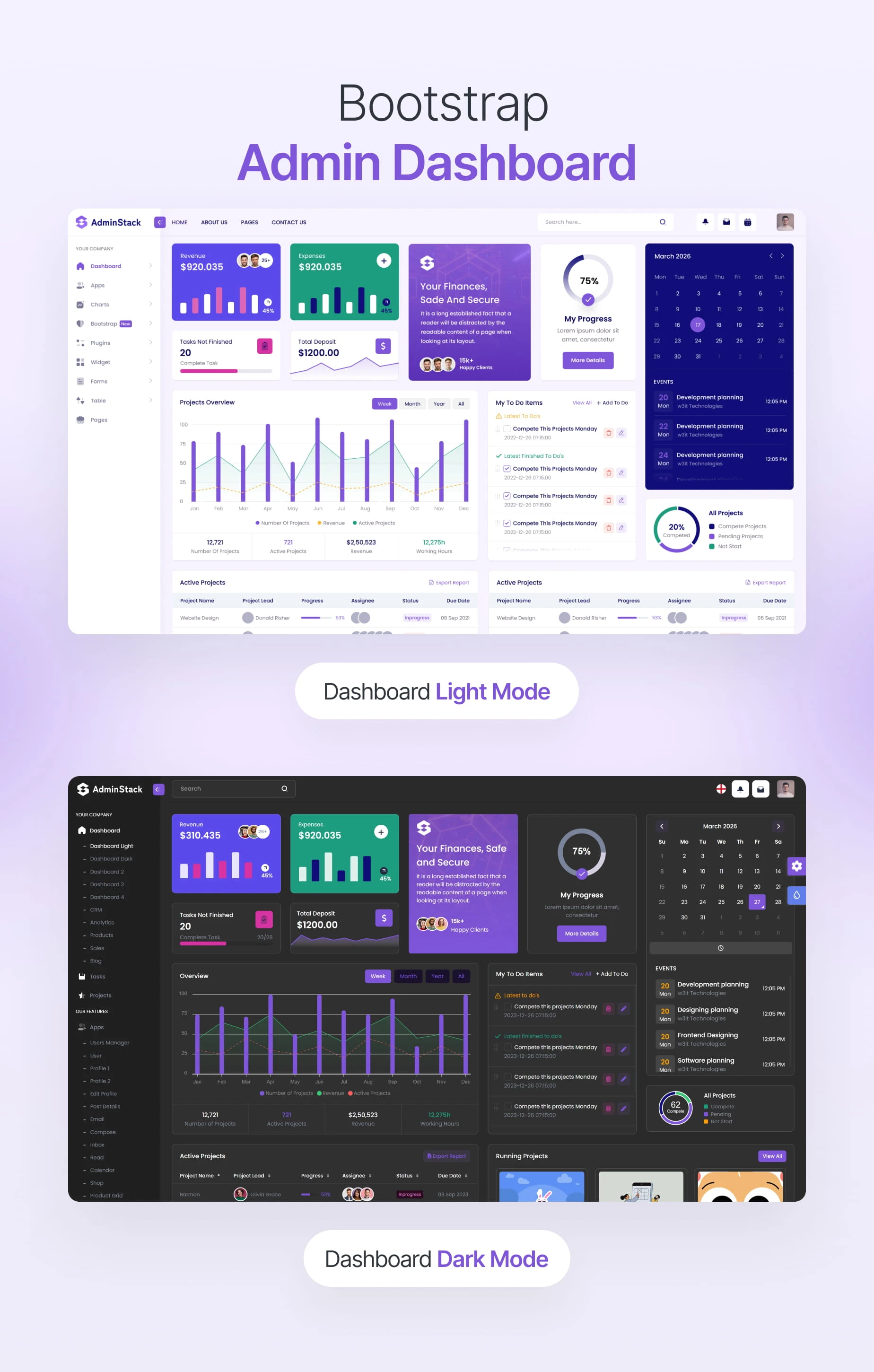 Dark and Light Mode Enhance user comfort and reduce eye strain with our admin template’s dynamic dark and light modes. Whether users prefer a sleek dark interface for a modern feel or a classic light mode, they can easily switch between the two modes based on their preference and environment.