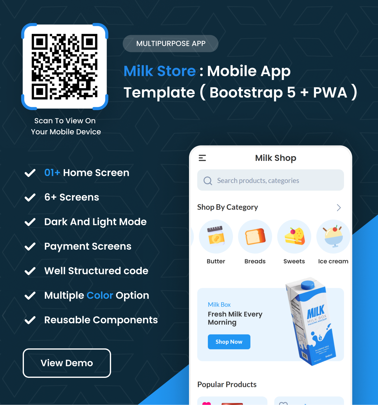 MilkStore the Power: Harness the power of PWA and Bootstrap with MilkStore, a robust and widely-used framework, to develop a Ecommerce and other mobile applications that are designed to elevate your mobile endeavors to new heights.